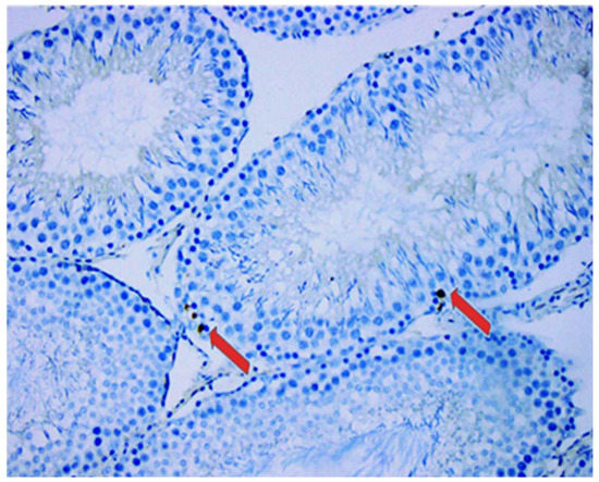 Immunohistochemical analysis of apoptotic activity. Positive immunostaining for cleaved caspase 3 in germ cells (red arrow), magnification ×40.