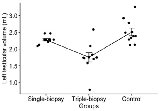 A significant difference in left testicle volume between experimental groups has been determined (p < 0.001). Post hoc analysis using the Holm’s method revealed a statistically significant difference between the single and triple-biopsy groups (p < 0.01); thus, the rats from the triple-biopsy group had a significantly smaller left testicular volume compared to the rats from single biopsy group. The same finding was noted between the triple-biopsy and control groups (p < 0.001) which shows that the volume of the left testicle of the rats from control group is significantly higher compared to the rats triple-biopsy group, while no significant difference was found between the rats from single-biopsy and control groups (p > 0.05) (Figure 4).