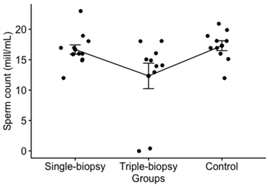Sperm count analysis revealed a difference between the observed groups. Post hoc analysis showed that single-biopsy group did not have a statistically significantly different sperm count compared to triple-biopsy (p = 0.130) and control (p = 0.380) groups, while the sperm count between the triple-biopsy and control groups was of borderline statistical significance (p = 0.05) (Figure 5).