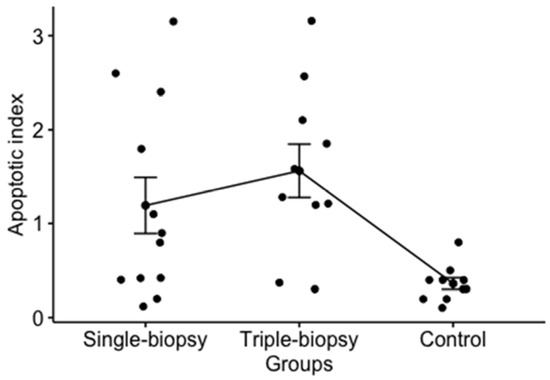 Analysis of the apoptotic index showed a significant difference for left testis between the experimental groups (p < 0.01). Post hoc analysis using Games-Howell test determined statistically significant difference between the triple-biopsy and control groups (p < 0.01) and single-biopsy and control groups (p = 0.015). Using Games-Howell test higher apoptotic index in single and triple-biopsy groups compared to control group has been determined, while between the single and triple-biopsy groups no statistically significant difference was found (p = 0.650) (Figure 6).