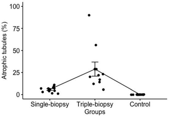 A statistically significant difference in the percentage of atrophic tubules between the experimental groups was found (p < 0.001), which was confirmed by post hoc analysis using the Holm’s method. The difference between the single and triple-biopsy groups (p < 0.001) has revealed statistically higher percentage of atrophic tubules in triple-biopsy group compared to the single-biopsy and control groups which had no atrophic tubules (p < 0.001). In addition, a statistically significant difference between the single and triple-biopsy groups was found (p < 0.001) (Figure 7).