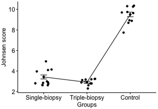 The value of Johnsen score for the left testicle between the experimental groups was shown as statistically significant parameter (p < 0.001). Post hoc analysis using Holm method showed statistically significant difference between all of the observed groups (single and triple-biopsy, p < 0.05; single-biopsy and control, p < 0.001; triple-biopsy and control, p < 0.001). Control group had the maximum score while single and triple-biopsy groups had differences in the Johnsen score (Figure 8). Despite the statistically significant difference between the single and triple-biopsy, this difference has no clinical value.