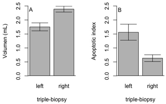 Comparison of the (A)—volume and (B)—apoptotic index of the left (punctured) and right (intact) testicles in triple biopsy group (Student t-test, p < 0.01).