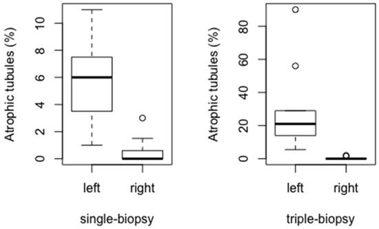 Higher percentage of atrophic tubules has been found in the group of left (biopted) testicles compared to the right (intact) testicles in single-biopsy (p < 0.001) and triple-biopsy (p < 0.001) groups (Figure 10).