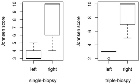 The value of Johnsen score was significantly lower in the left (biopted) testicles compared to the right (intact) testicles in both single-biopsy (p < 0.001) and triple-biopsy (p < 0.001) groups (Figure 11).