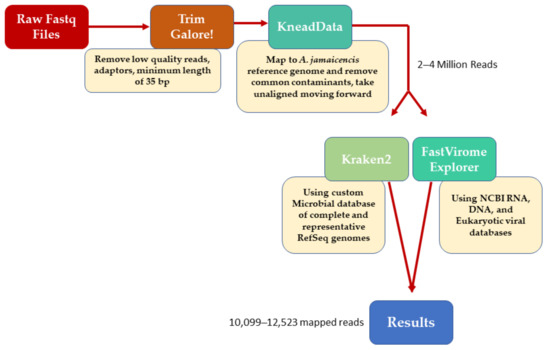 Libraries for shotgun metagenomic and meta-transcriptomic sequencing were pooled and run on a single lane of an Illumina HiSeq 2500 (Illumina, San Diego, CA, USA) Quality of raw reads was assessed using FastQC version 0.11.8; the reads were then trimmed using Trim Galore (v 0.6.4) (https://www.bioinformatics.babraham.ac.uk/projects/trim_galore/ (accessed on 1 May 2020)) to remove Illumina universal adaptors, bases with a quality score <20, and reads shorter than 35 bp. Trimmed reads were mapped to the A. jamaicencis reference genome (https://www.ncbi.nlm.nih.gov/genome/12026?genome_assembly_id=437954 (accessed on 1 May 2020)) using KneadData (v0.7.4) (https://huttenhower.sph.harvard.edu/kneaddata/). Reads mapping to the host was removed from further analysis, leaving 2–4 million reads per sample. Taxonomic classification was performed using Kraken2 (https://genomebiology.biomedcentral.com/articles/10.1186/s13059-019-1891-0 (accessed on 1 May 2020)) with the microbial database compiled by the Loman Lab available online (https://lomanlab.github.io/mockcommunity/mc_databases.html (accessed on 1 May 2020)). This database includes all complete and representative genomes available in RefSeq for archaea, bacteria, fungi, protozoa, viral, and UniVec_Core sequences. In addition to this, viral sequences were profiled using FastViromeExplorer (https://peerj.com/articles/4227/ (accessed on 1 May 2020)) against the NCBI DNA, RNA, and eukaryotic viral databases available at FastViromeExplorer (https://bench.cs.vt.edu/FastViromeExplorer/ (accessed on 1 May 2020)). Estimated abundance is expressed as total read counts adjusted for the segment size of detected viruses (Figure 1).