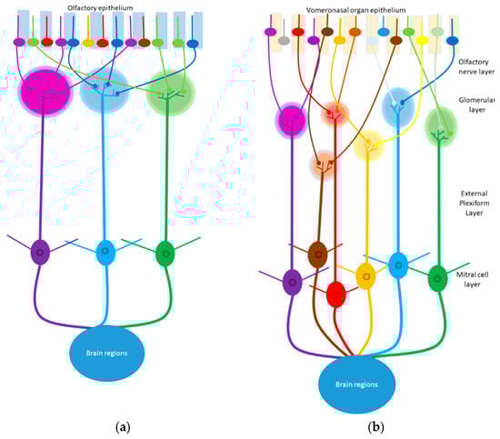 Schematic representation of sensory projections in the (a) main olfactory epithelium (MOE) and (b) vomeronasal organ (VNO). (a) Within the MOE, olfactory sensory neurons in the olfactory epithelium expressing the same specific odorant receptor have axons that innervate to the same glomerulus (represented by the different colours green, blue, and purple), which in turn excite specific mitral cells to act on specific brain regions. (b) Within the VNO, sensory neurons expressing the similar vomeronasal receptor innervate multiple small glomeruli, which excite mitral cells and thus specific brain regions. (Each colour represents a population of vomeronasal sensory neurons, that express one different type of vomeronasal receptor. Adapted from [].