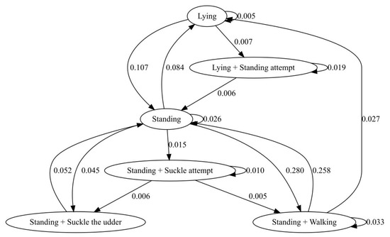 Transition flow diagram of the calves’ behaviours in the first 48 h after birth. The values represent the frequency of the transitions between the different behaviours. The diagram was obtained from the transition matrix exported from BORIS selecting the following behaviours: lying, standing, standing attempt, suckling attempt, walking, and suckling the udder. The final diagram was obtained from Graphviz, selecting the behaviours with a frequency of transition higher than 0.005.