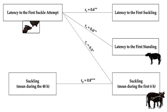 The correlations found between the latencies suggested that calves that took more time to stand also took more time to make the first suckling attempt, as previously reported in bovines by Campler et al. (2015) [27]. Similarly to Dubey et al. (2018) [17], calves that took more time to make the first suckling attempt took more time to suckle for the first time, and in our case, they also suckled less during the first six hours after calving. Moreover, the correlation found between the suckling and the postural behaviours (standing and walking) could be related to the calf’s vitality.