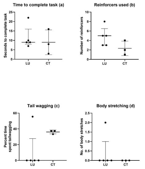 Figure 1. Variables assessed during the task (i.e., walking across the three plastic-coated plastic turf mats). Each individual pig is presented. Median and IQR (interquartile range) is shown on all four figures. (a) The time (seconds) it took each pig to complete the task. (b) The number of reinforcers the trainer used during the task. (c) Tail wagging during the task shown as percent of time spent tail wagging. (d). Body stretching. The number of body stretches shown by each pig during the task is shown. LU: luring, CT: Clicker training.