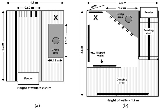 Layout and dimensions of the two housing systems: (a) farrowing crate (FC); (b) loose pen (LP). X denotes the position of the experimenter during the imposition of the positive human contact treatment.