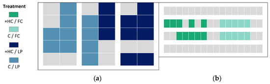 Allocation of positive human contact (+HC) and routine human contact (C) litters: (a) loose pen (LP) room; (b) farrowing crate (FC) room. Grey boxes in both housing systems represent non-experimental litters.