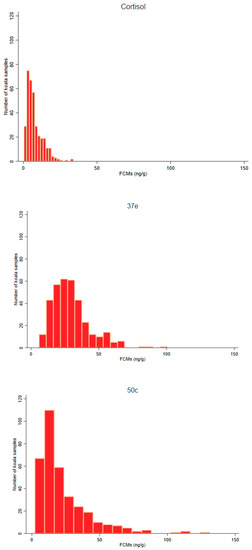 Histograms of the distribution of FCM values measured with the cortisol, 37e and 50c EIAs are shown in Figure 1. The mean, median, 25th, 75th percentile, interquartile range and minimum and maximum values for FCMs using a cortisol, 37e and 50c EIAs are shown in Table 2.