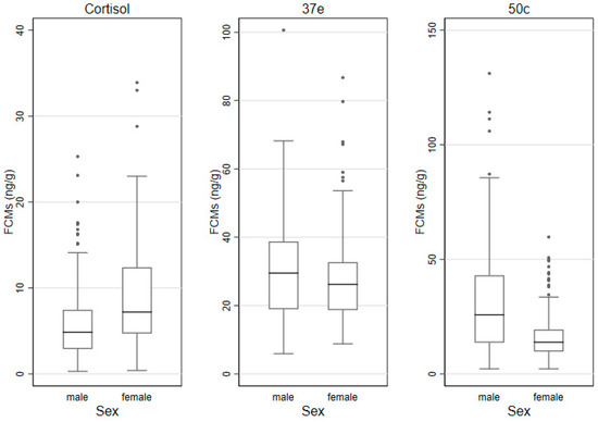 Box and whisker plots for FCM (faecal cortisol metabolite) levels (ng/g) measured with the cortisol, 37e (5α-pregnane-3β,11β,21-triol-20-one) and 50c (tetrahydrocorticosterone) EIAs (enzyme immunoassays), as grouped by sex (defecations: males n= 164; females n= 187).