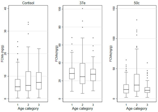 Box and whisker plots for FCM (faecal cortisol metabolite) levels (ng/g) measured with the cortisol, 37e (5α-pregnane-3β,11β,21-triol-20-one) and 50c (tetrahydrocorticosterone) EIAs (enzyme immunoassays), as grouped by age categories (1: ≤2 years-; 2: >2–5 years-; 3: >5 years; defecations n= 124, n= 159 and n= 68 respectively).