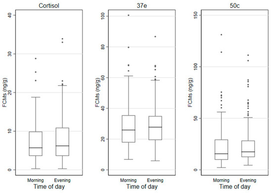 Box and whisker plots for FCM (faecal cortisol metabolite) levels (ng/g) measured with the cortisol, 37e (5α-pregnane-3β,11β,21-triol-20-one) and 50c (tetrahydrocorticosterone) EIAs (enzyme immunoassays) in morning and evening samples (defecations: n = 182 and n = 169 respectively).