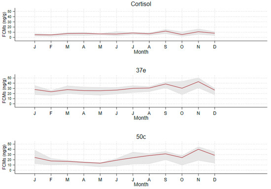Monthly mean (red line) and 95% percentile (shaded area) FCM (faecal cortisol metabolite) values (ng/g) measured with the cortisol, 37e (5α-pregnane-3β,11β,21-triol-20-one) and 50c (tetrahydrocorticosterone) EIAs (enzyme immunoassays) (defecations: n = 351).