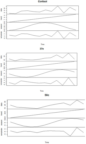 The decomposition of the time series dataset highlighted a strong seasonal trend for 37e (Augmented Dickey–Fuller test = −1.4224, p-value = 0.7924 for hypothesis of stationary time series) and 50c (Augmented Dickey–Fuller test = −2.1821, p-value = 0.503), but less so for cortisol (Augmented Dickey–Fuller test = −3.391, p-value = 0.079).