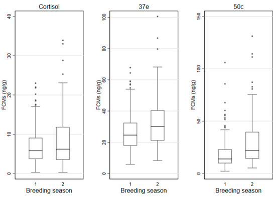Box and whisker plots for FCM (faecal cortisol metabolite) values (ng/g) measured with the cortisol, 37e (5α-pregnane-3β,11β,21-triol-20-one) and 50c (tetrahydrocorticosterone) EIAs (enzyme immunoassays) (1: non-breeding season (February–August); 2: breeding season (September–January); defecations: n = 199 and n = 152 respectively).