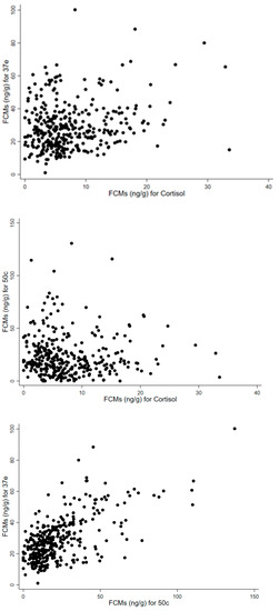 The Pearson Correlation coefficient for 37e vs. cortisol was 0.2426 (p < 0.0001), for 50c vs. cortisol was −0.0039 (p = 0.9423) and for 37e vs. 50c was 0.6776 (p < 0.0001). Thus, a strong, significant correlation was only observed for the relationship between FCM concentrations measured with the 37e and 50c EIAs.