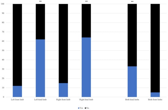Claw lesions were found significantly more often (p < 0.01) in the hind limbs than in the front limbs. Distribution of percentage of affected limbs is presented in Figure 1. There was no significant difference in laterality of claw lesions. A total of 33.3% (n = 39) of animals was diagnosed with claw lesions in both hind limbs, and 4% (n = 5) with claw lesions in both front limbs. Claw lesions were found significantly more often (p < 0.01) in both hind limbs compared with both front limbs.