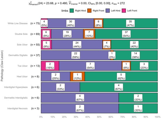 In total, 272 claw lesions were diagnosed in 117 cattle. Distribution of pathologies in total and for each limb is given in Figure 2. There was no significant association between particular claw lesions and a particular limb (p = 0.480).