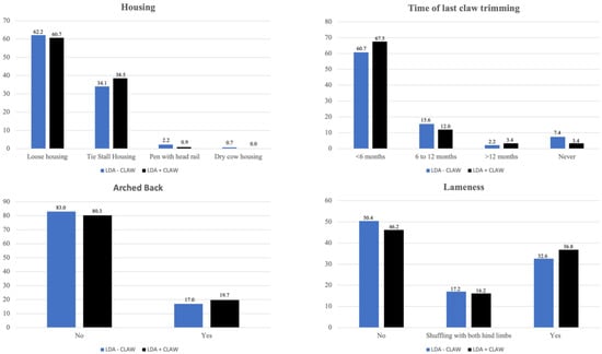 Age distribution (given as mean age in years) of the animals grouped according to the time of the last functional claw trimming at home is given in Table 4. Distribution of housing, time of last claw trimming, occurrence of an arched back, and lameness is given in Figure 3. Significant differences for lameness and posture within LDA − CLAW and LDA + CLAW are presented in Table 5. There were no significant differences in occurrence of an arched back or lameness between LDA − CLAW and LDA + CLAW.