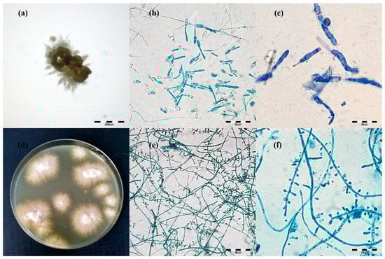 Different results were obtained for 17 samples. After 7 days of incubation of the material, the macro- and micro-morphological picture was unclear and exhibited not only macroconidia resembling the so-called rat tails, but also numerous small clavate microconidia. Such a morphological picture was not typical of T. verrucosum [,,]. After the next 14 days (21st day of culture), the morphological appearance of these samples changed significantly. The size of the colonies was in the range from 8 to 12 mm. On the edge of the colony structure, there was a dense velvety light beige surface, which became suede-like, cauliflower-convex, and brown closer to the center. The micromorphological picture revealed chains of circular chlamydospores, small oval to clavate microconidia laterally inserted at the hyphae, and cigarette-shaped septated macroconidia. The morphological image appeared to be characteristic of more than one species of dermatophytes. Separate cultures were made by grafting a fragment of the mycelia from the margins and from the center of the colonies. After three passages, two separate pure dermatophyte cultures were obtained. One of them was characteristic of T. verrucosum, whereas the morphological identification of the other one revealed T. benhamiae (Figure 2d–f).
