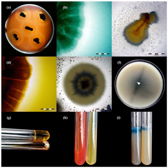 Enzymatic activity of Trichophyton verrucosum isolates after 21 days of incubation (picture (a,f–i): Nikon D3300, lens Nikon 18–105 mm VR; picture, (c–e): Olympus SZ61, Tokio, Japan). Legend: (a), haemolysis; (b), protease; (c), lipase; (d), phospholipase; (e), elastase; (f), DNase; (g), gelatinase; (h), urease; (i), keratinase.