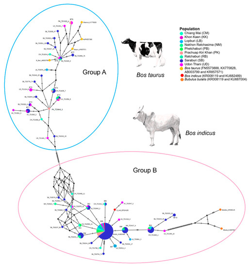 The network analysis reveals two major nodes, with an indication of expansion of the founding haplotypes, in an otherwise complex network derived from several singletons. The two major nodes (A and B) were connected by 17 mutational steps to the remaining nodes. Approximately 37.5% of the sampled individuals from Saraburi belonged to the major node A and 62.5% to the major node B group (Table S1). This result suggests that most dairy cattle populations were an outcome of gene flow from B. indicus in the recent past. By contrast, individual contributions of the remaining 73 populations ranged from 14.84% in the case of Udon Thani, Chiangmai, Prachuap Khiri Khan, Khon Kaen, and Lopburi populations in the A clade, to 59.36% in the Chiang Mai, Nakhon Ratchasima, Khon Kaen, Ratchaburi, Lopburi, Udon Thani, and Phetchaburi populations in the B clade. This finding points to a decline in D-loop haplotype complexity in these populations with distance from the sampling sites in the Saraburi population. This may be the result of intensive selection operating mainly through paternal lineages. However, it was surprising to note a strong effect on mitochondrial genetic diversity. Certain branches in the network are indicative of ancient differentiation of some maternal lineages of B. taurus and B. indicus. These results have important implications for rational decision-making involved with breeding strategy and observations of breeding value. Availability of whole-genome single-nucleotide polymorphism arrays has improved the accuracy of genomic studies and provided information on the current status of cattle genetic resources [72].