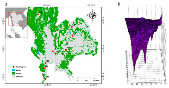Geographic analyses of the Bos taurus data set. (a) Geographic distribution of the nine B. taurus populations (Chiang Mai: CM; Khon Kaen: KK; Lopburi (LB); Nakhon Ratchasima: NM; Phetchaburi: PB; Prachuap Kiri Khan: PK; Ratchaburi: RB; Saraburi: SB; and Udon Thani: UD). (b) Genetic landscape interpolation plots for mitochondrial D-loop sequence data depicting areas with high or low genetic differentiation based on geographic coordinates. Bright purple indicates low genetic diversities. Low nucleotide diversities within populations located on livestock farms were found in the central region (Lopburi, Phetchaburi, and Ratchaburi).