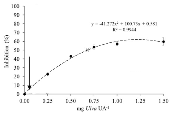 Inhibitory response of European sea bass intestinal proteases after incubation with increasing doses of raw or heat-treated Ulva extracts (graph adapted from Vizcaíno et al., 2020) [11]. The inhibition value (% over a control) corresponding to 0.02 mg Ulva/U activity is represented by an arrow.