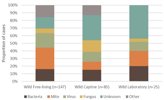 Proportion of the top five causes of dermatitis reported in terrestrial mammalian wildlife, summarized into each captive or free-ranging group. Captivity status consists of wild free-living, wild-captive and wild-laboratory. The percentage of definitive dermatitis causes reported in wildlife is shown for each group.
