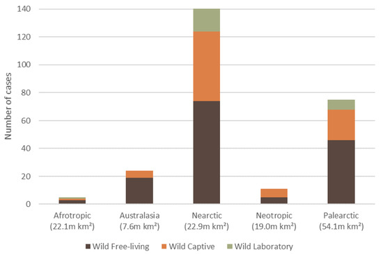 The total number of reported dermatitis cases split into captivity status (wild free-living, wild captive and wild laboratory), for five of the six biogeographical realms (ecozone) where mammalian wildlife dermatitis cases were reported in the literature, with an ecozone area (million km2). There was one wild captive case recorded for the Indomalaya (7.5 m km2) ecozone, which is not displayed.