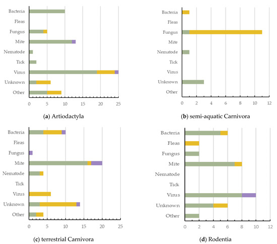 Artiodactyla had the highest number of dermatitis cases reported (n = 71, 27.6%, 5 ecozones), with viruses being the greatest cause of dermatitis in this order (Figure 4a). Semi-aquatic Carnivora had the lowest number of cases reported (n = 16; 6.2%; 2 ecozones), with fungus being their most common cause (Figure 4b). Terrestrial Carnivora was second highest (n = 59; 23.0%; 5 ecozones), with mite cases being most prevalent (Figure 4c). Rodentia had 36 dermatitis cases reported (14.0%; 3 ecozones), with viruses being the greatest cause of dermatitis in this mammal order (Figure 4d). Primates had 23 dermatitis cases reported (8.9%; 4 ecozones), and the most prominent causes reported were either bacteria or unknown (Figure 4e). Diprotodontia had 19 dermatitis cases reported (7.4%; 2 ecozones), often with an unknown cause (Figure 4f).