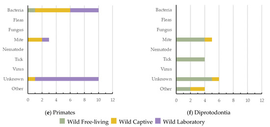 Primates had the highest number of species and cases of dermatitis for wild laboratory mammals (Figure 4e). Terrestrial Carnivora had the highest number (14) of unknown dermatitis causes. Interestingly, mites have been shown to cause dermatitis across all orders except semi-aquatic Carnivora. Bacteria was responsible for dermatitis cases in all orders except Diprotodontia, with viruses reported as a cause of dermatitis in only three (Figure 4).