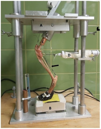 For mechanical testing, a limb press was used that has been adapted for feline hindlimbs by Kneifel et al. [16,18]. It comprised a rectangular base plate connected by a column (90° angle) in each corner to an equal-sized top plate. Connection was achieved over drilled holes allowing the top plate to slide up and down and to be secured with screws. To measure the created patellar tendon load (PTL), a device mounted on the top plate held a force gauge (Sauter FA-100; Sauter GmbH, Vienna, Austria) connected to the wire, simulating the quadriceps mechanism. The paw was placed on a pedestal with a rough surface and additionally fixed with a K-wire. The pedestal was placed in the center of a scale (WPT 30F1/K, 0.01 kg digit; Radwag Wagi Elektroniczne, Krakow, Poland) to measure the body mass applied to the hindlimb (Figure 1). In addition, at 0.5 cm distal to the stifle joint surface, the caudal aspect of the tibia was connected to a spring mechanism to keep the tibial plateau from translating cranially relative to the femur.