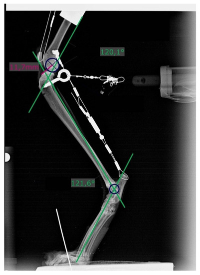 - Miller, J.M.; Shires, P.K.; Lanz, O.I.; Martin, R.A.; Grant, J.W. Effect of 9 Mm Tibial Tuberosity Advancement on Cranial Tibial Translation in the Canine Cranial Cruciate Ligament-Deficient Stifle. Vet. Surg. 2007, 36, 335–340. [Google Scholar] [CrossRef] [PubMed]