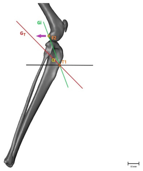 Illustration of the changes within the angle representing craniocaudal movement (α), showing that the angle becomes smaller after CrCL transection as the tibial crest (T1) is cranially displaced. α = measured angle; orange point T1 = point 1 cm distal to the tibial crest; orange point F2 = lateral aspect of lateral fabella in an intact CrCL; green line Gi = vector between measured points with an intact CrCL; red line GT = vector between measured points with a transected CrCL; violet arrow = illustration of movement when the CrCL is transected. Scale bar indicates 10 mm.