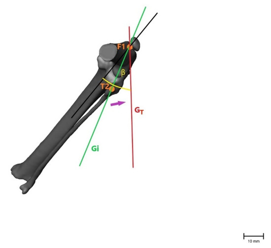 Illustration of the changes within the angle representing internal rotation of the tibia (β), showing that the angle becomes larger after CrCL transection as with internal rotation of the tibia when the fibular head (T2) moves laterally. β = measured angle; orange point T2 = fibular head in an intact CrCL; orange point F1 = proximal aspect of the trochlea groove in an intact CrCL; green line Gi = vector between measured points with an intact CrCL; red line GT = vector between measured points with a transected CrCL; violet arrow = illustration of movement when the CrCL is transected. Scale bar indicates 10 mm.