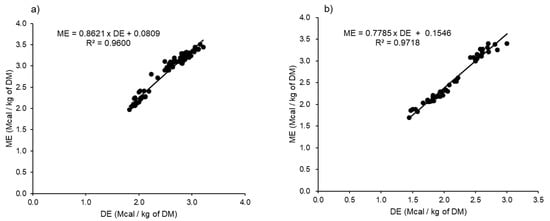 Relationship between the digestible energy (DE) and metabolizable energy (ME) concentrations by gender: male (a) and female (b) cattle (unadjusted citation for random differences in the intercepts). DM; dry matter.