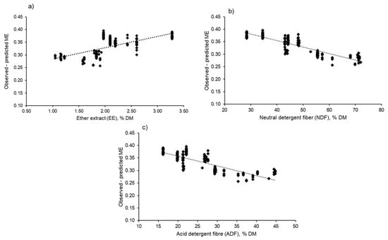 Residual analyses (n = 141) of the predicted ME using simple linear regression (Equation (2)) with the EE (a), NDF (b) and ADF (c). DM; dry matter.