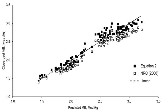 Relationship between the observed ME and predicted ME from the DE using DE × 0.82 (NRC, 2000) and using Equation (2) (ME = 0.9215 × DE − 0.1434) generated in this study.