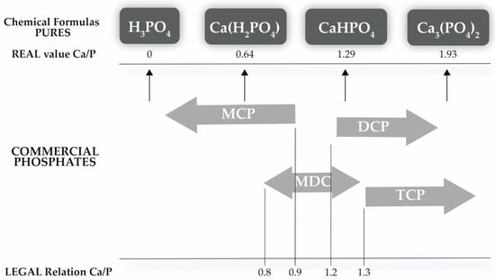 A low absorption and retention of nutrients will mean a higher discharge into water, affecting the sustainability of the production. Aquaculture effluents with high levels of P and N contribute to the pollution of the aquatic ecosystem through the eutrophication of natural fresh water. Consequently, aquaculture faces a dilemma: feed must meet P levels, but at the same time, feeding practices must comply with environmental guidelines to minimize the P load in the aquatic environment []. Inorganic commercial phosphates, under European Union Regulation [], can be easily found on the market, being categorized according to the Ca/P ratio (Figure 1). This is due to commercial phosphates coexisting without a defined chemical composition, in the case of mixtures of monocalcium phosphate (MCP), dicalcium phosphate (DCP), phosphoric acid, carbonate and impurities. This undefined chemical composition is explained by the appearance of unwanted collateral reactions, events difficult to avoid at the industrial scale. This compositional variability causes different degrees of solubility in both water and citric acid, as well as variations in pH and the presence of other minerals. The mixture of chemical products ends up directly influencing the degree of bioavailability of the phosphate species in each species, which is defined as the degree to which a nutrient ingested from a particular source is absorbed and remains available for the animal’s metabolism [].