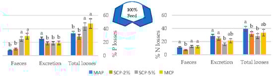 In the case of N, SCP-2% showed the lowest N discharge by fecal losses (7.2%), but in the case of N excretion, SCP-5% provided lower values (15.8%) than MAP (28.0%). Therefore, SCP-2% and SCP-5% showed the lowest total waste of N (31.54 and 28.25%, respectively) and MAP showed the highest values (39.01%) of total N intake.