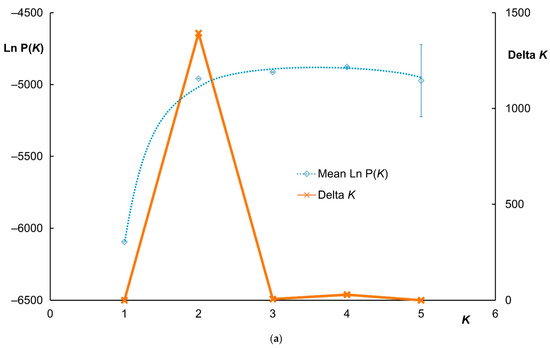 - Evanno, G.; Regnaut, S.; Goudet, J. Detecting the number of clusters of individuals using the software STRUCTURE: A simulation study. Mol. Ecol. 2005, 14, 2611–2620. [Google Scholar] [CrossRef] [PubMed]