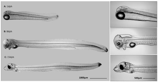 - Bagarino, T. Yolk resorption, onset of feeding and survival potential of larvae of three tropical marine fish species reared in the hatchery. Mar. Biol. 1986, 91, 449–459. [Google Scholar] [CrossRef]
