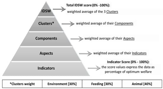 The welfare status of the herds was evaluated by skilled personnel according to the computerized Integrated Diagnostic System Welfare (IDSW) model [13]. The IDSW evaluates the welfare condition of the herd adopting a hierarchical structure (Figure 1), and its outcome has been previously submitted to preliminary validation with blood analytes [21]. Scores are expressed as percentages with 0 and 100% representing the worst and best welfare condition (defined according to well established standards), respectively. The total IDSW score is a pooled-mean of the scores attributed to three “clusters”. The contribution to the total IDSW score is: 30% from the “environment” cluster, 30% from the “feeding” cluster and 40% from the “animal” cluster. Each “cluster” is scored based on the evaluation of several “components”, and each “component” is scored based on the evaluation of several “aspects”. Finally, each aspect is scored based on the evaluation of several specific “indicators”. Detailed description of the sets of “components”, “aspects” and “indicators” considered in the evaluation of each “cluster”, as well as their contribution to the total IDSW score have been defined previously [13].