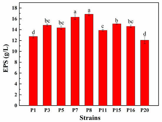 EPS production capacity of selected LAB isolates is shown in Figure 1. It can be seen that after 72 h incubation at 37 °C, significant differences in EPS produced by these 9 isolates were observed, and the EPS quantity ranged between 12.07 and 16.86 g/L. Isolate P8 produced the highest content of EPS at 16.86 g/L, while P20 produced the lowest at 12.07 g/L. Consequently, strains P3, P5, P7, P8, P11, P15, and P16 with the relatively strongest EPS-producing ability were selected for further research.