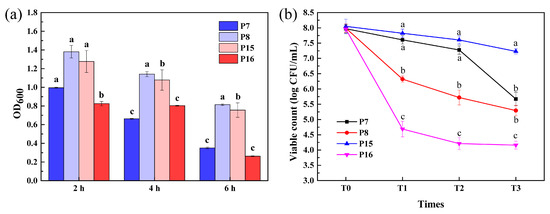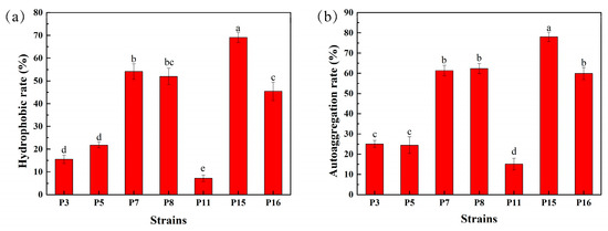 The adhesion ability of 7 selected LAB isolates is shown in Figure 2. Among these strains, P7, P8, P15, and P16 had a hydrophobic rate of more than 45.40%, of which P15 had the highest at 69.07%, and P11 had the lowest at only 7.17% (Figure 2a). The auto-aggregation ability of isolates is shown in Figure 2b. After 8 h treatment, the auto-aggregation rate for P7, P8, P15, and P16 was higher than 59.90%, and for P11 was only 15.13%; P15 also showed the highest ability at 78.00%. Based on the results presented in Figure 2, isolates P7, P8, P15, and P16 were chosen for further study.